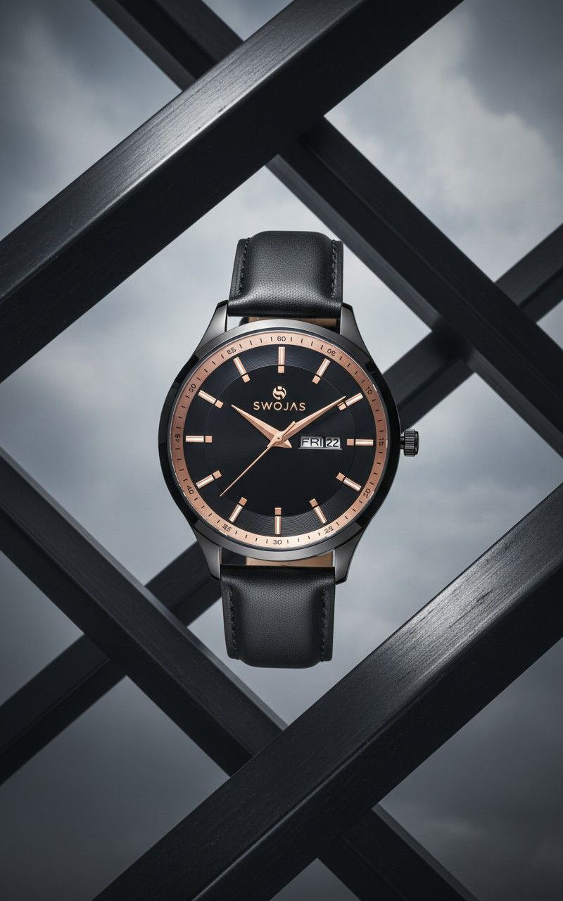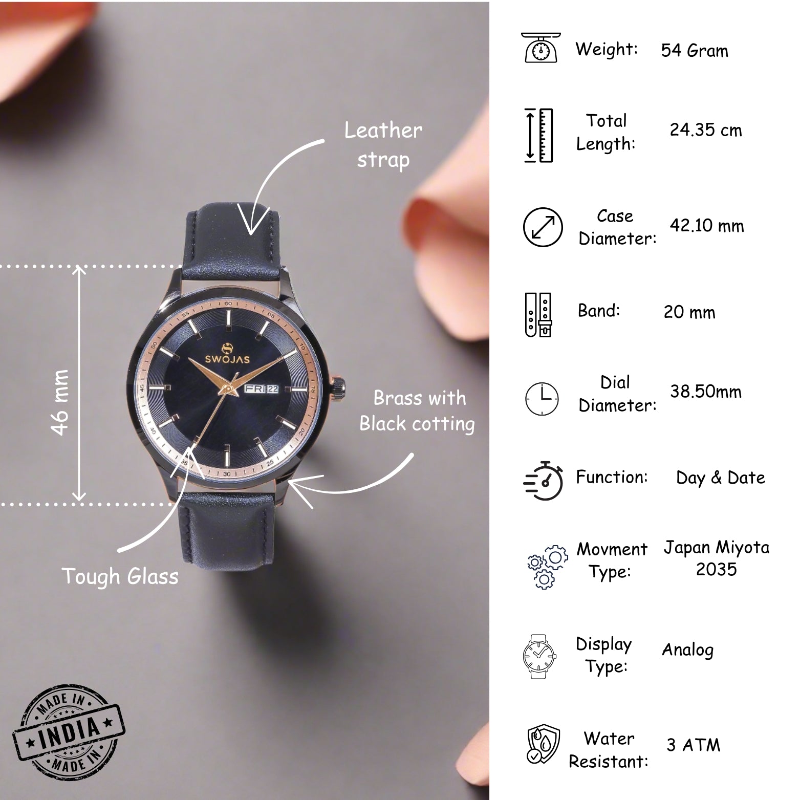 Swojas Mens Classic Watch: Black Dial Rose Ring With Reco Turning With Rose Gold Index With Lather Strep.