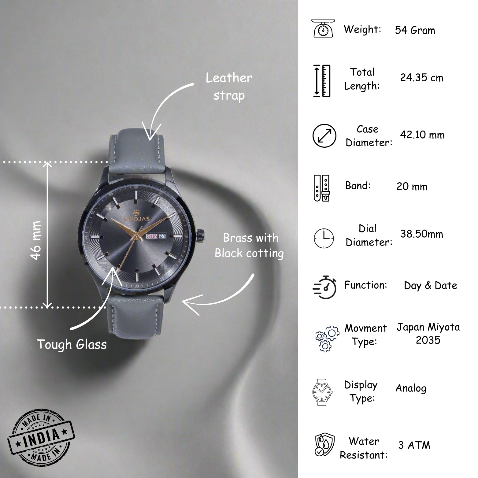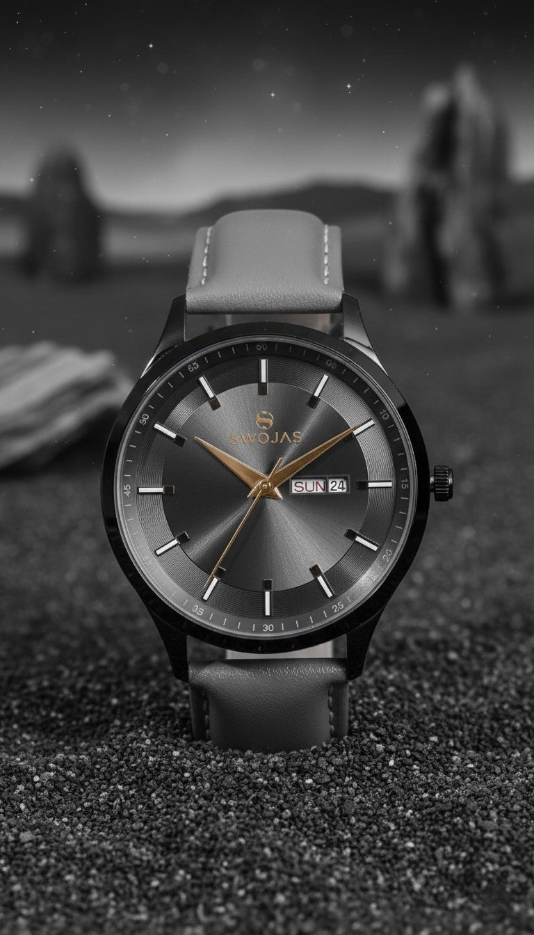 Swojas Mens Classic Watch: Grey Dial With Reco Turning With Rose Gold Index With Lather Strep