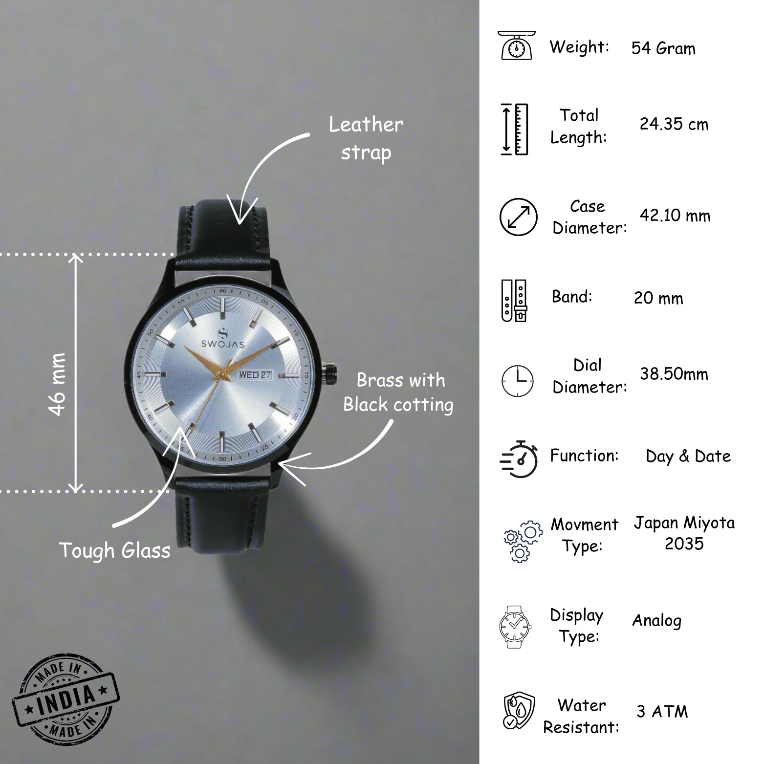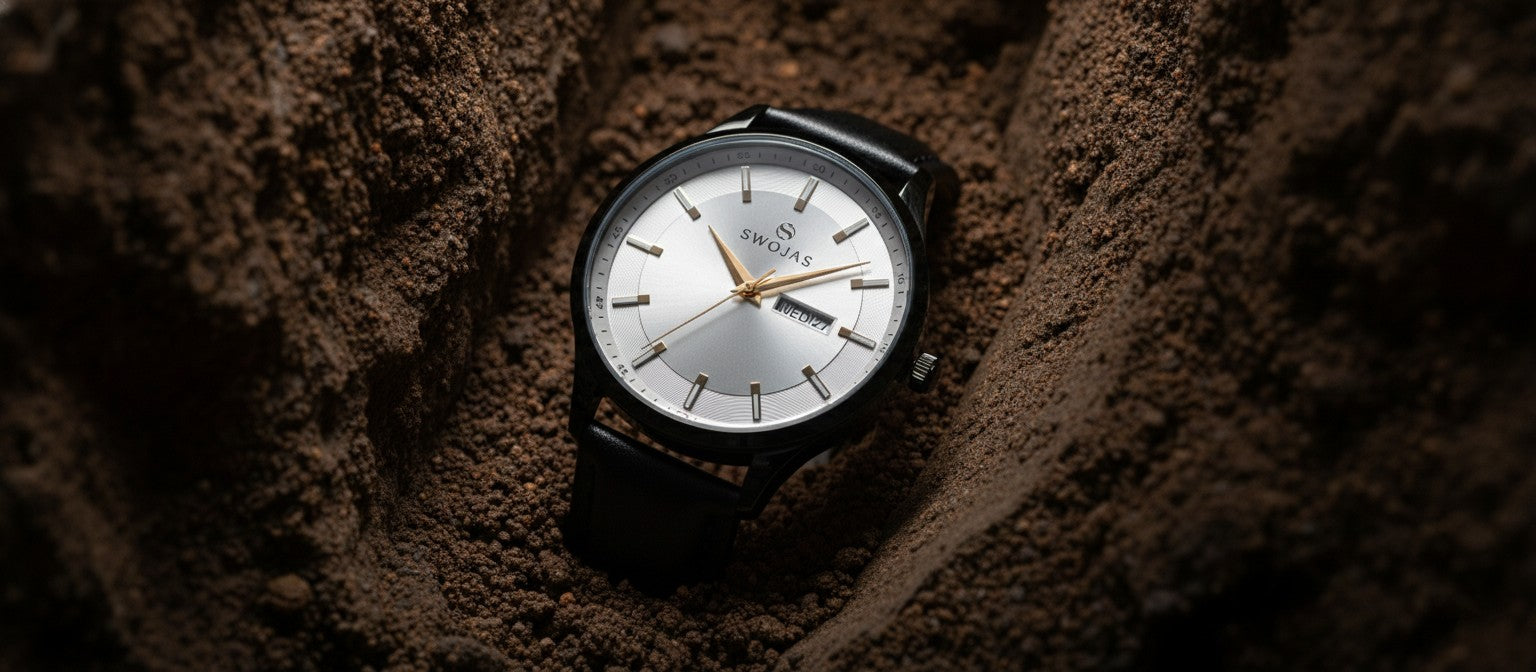 Swojas Mens Classic Watch: Silver Dial With Reco Turning With Rose Gold Index With Lather Strep