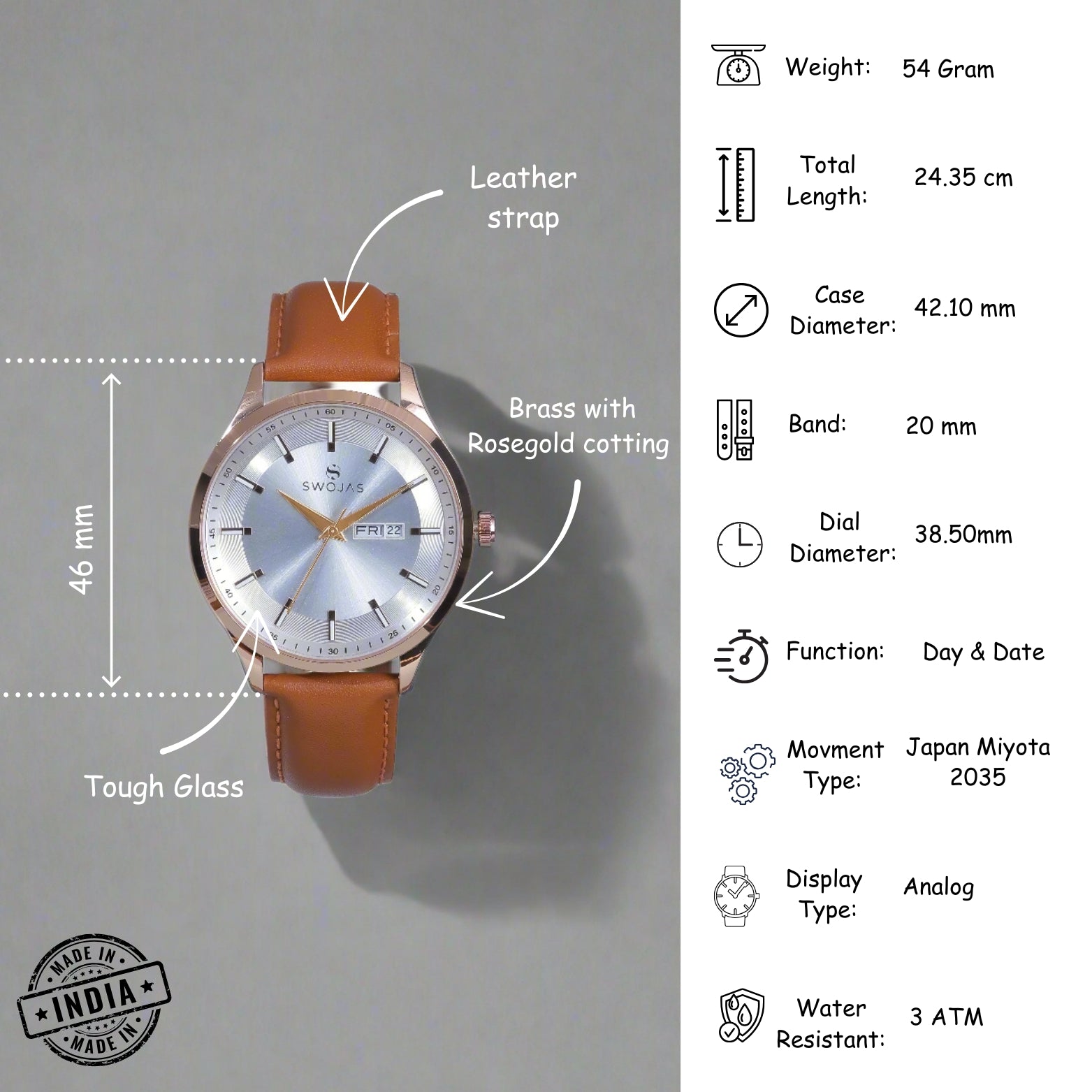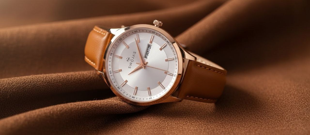 Swojas Mens Classic Watch: Silver Dial With Reco Turning With Rose Gold Index With Lather Strep.